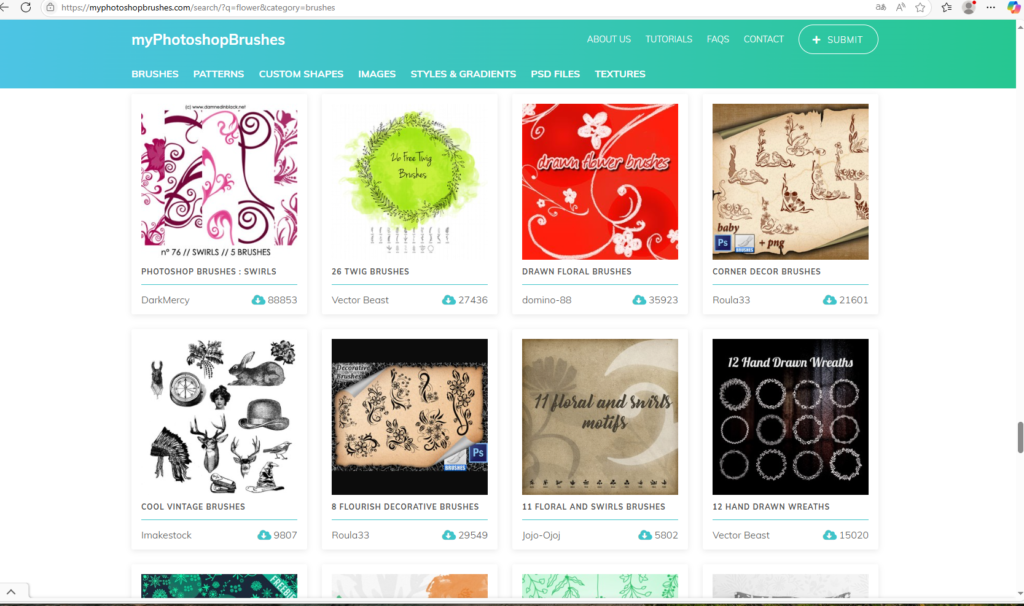 このサイトに行って、検索バーに「flower」と入力し、「All Categorys」のところにカーソルを合わせたら「Brushes」にして「Search」を押しましょう。