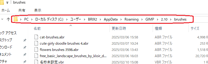 このブラシをGIMPで使えるようにするため、「baby-brushes.abr」を移動します。
