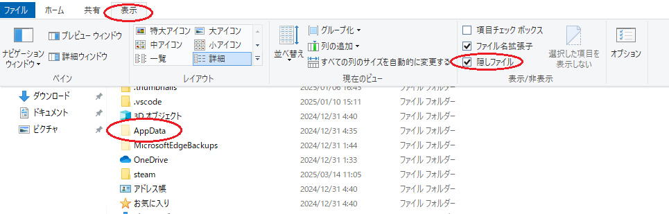ちなみに「AppData」フォルダは隠しファイルなので、いないなー、という人は、表示を押すと出てくるバーの「隠しファイル」にチェックをつければ出てきます。