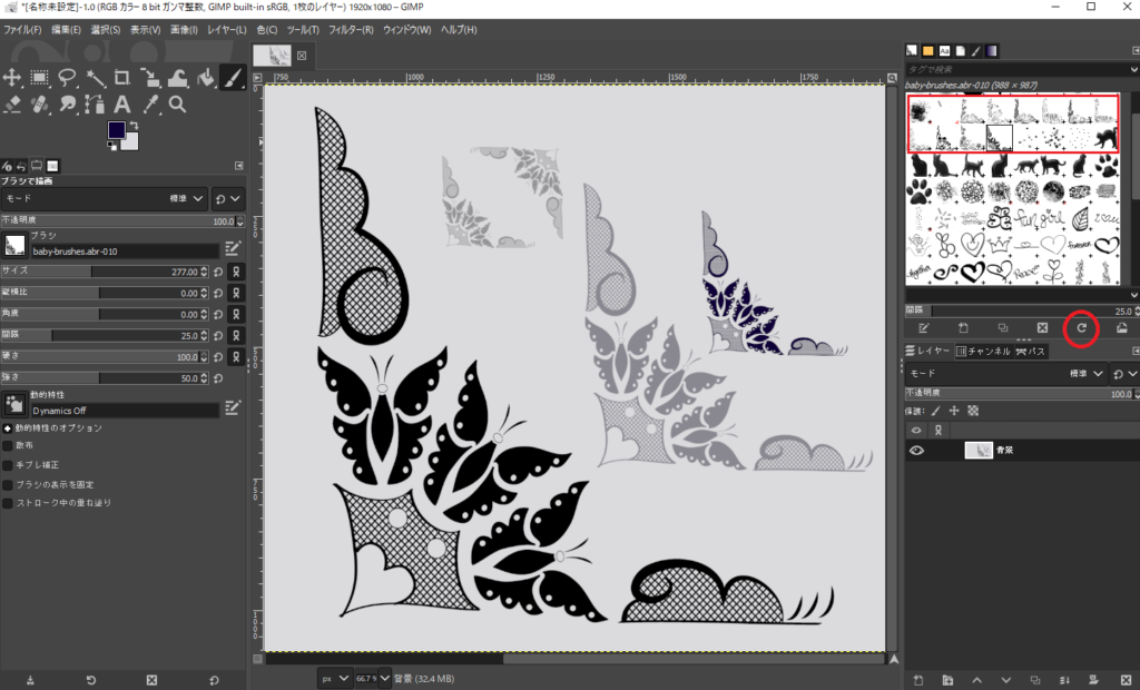 ちなみに、再起動しなくても赤丸部分の丸矢印を押せば内容更新で追加したブラシが出現します。