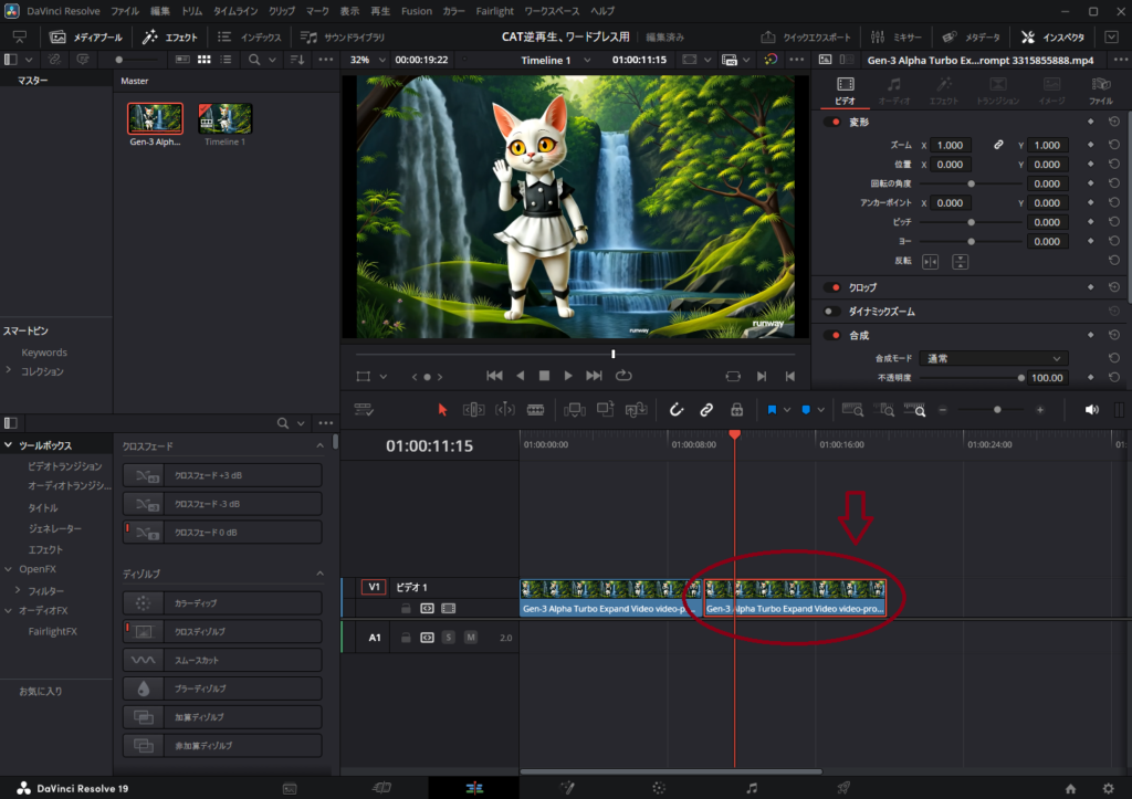 猫が手を振るんですけど、もう少し長くしたいなと思って再生後に逆再生をつけて繰り返そうと思いました。