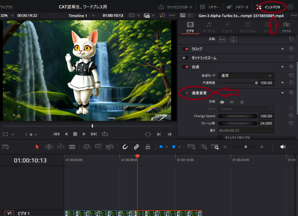 右上、「インスペクタ」タブの中、少しスクロールすると「速度変更」というところがあります。
