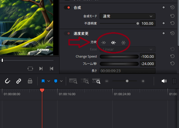 速度変更のところで、現在右を向いている矢印「→」を、左向きの矢印「←」にします。ポチッと。